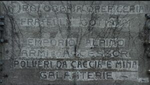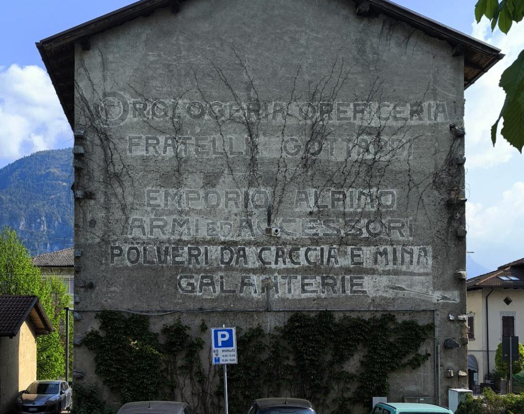 Le lettere, ormai sbiadite e attraversate dall’edera, raccontano un mondo intero: OROLOGERIA, OREFICERIA FRATELLI GOTTARDI, EMPORIO ALPINO, ARMI ED ACCESSORI, POLVERI DA CACCIA E MINA, GALANTERIE.